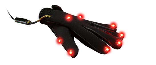 These durable gloves come with eight LEDs total: one the tips of the fingers (two LEDs on the thumb), and two LEDs on the back of the hand. As with all PhaseSpace LEDs, the glove is also available with infrared LEDs. The glove is connected to the multi-LED board.